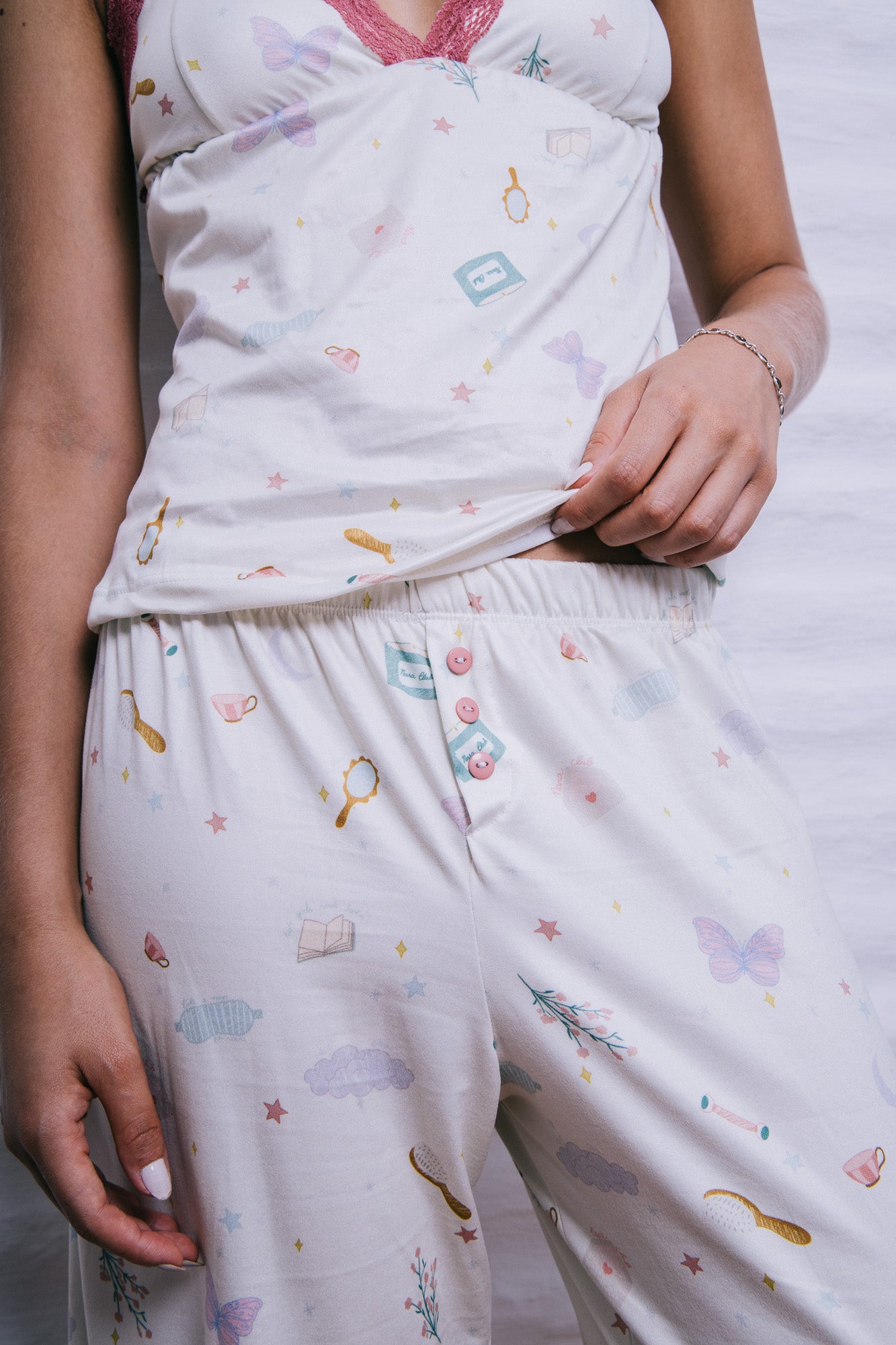 Pijama muito fofo, veste bem no corpo e tem um tecido confortável. Esperando reposição da calça morango plumeria no tamanho P pra eu comprar também, comprei apenas o short e a blusa.